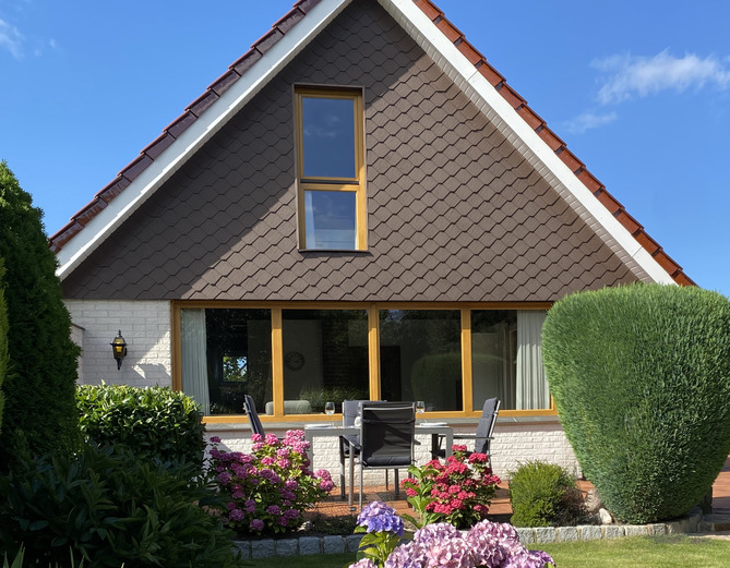 Gemütliches Ferienhaus mit Strandkorb im Garten + 1 Strandkorb am Strand, 150 Meter zum Strand, in einer ruhigen Ferienhausanlage gelegen. Mit Anbau am Haus der für Fahrräder etc. mitbenutzt werden kann.